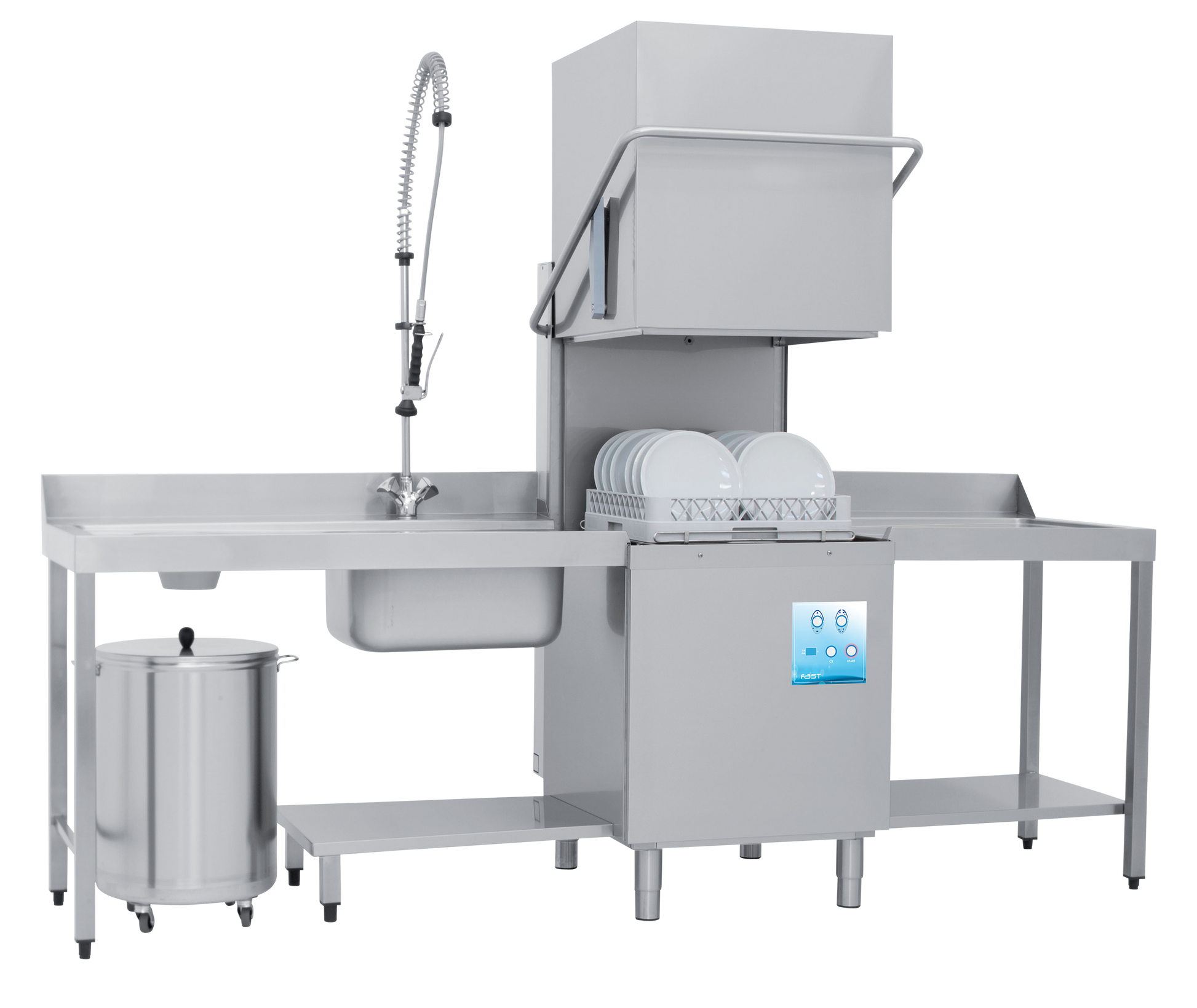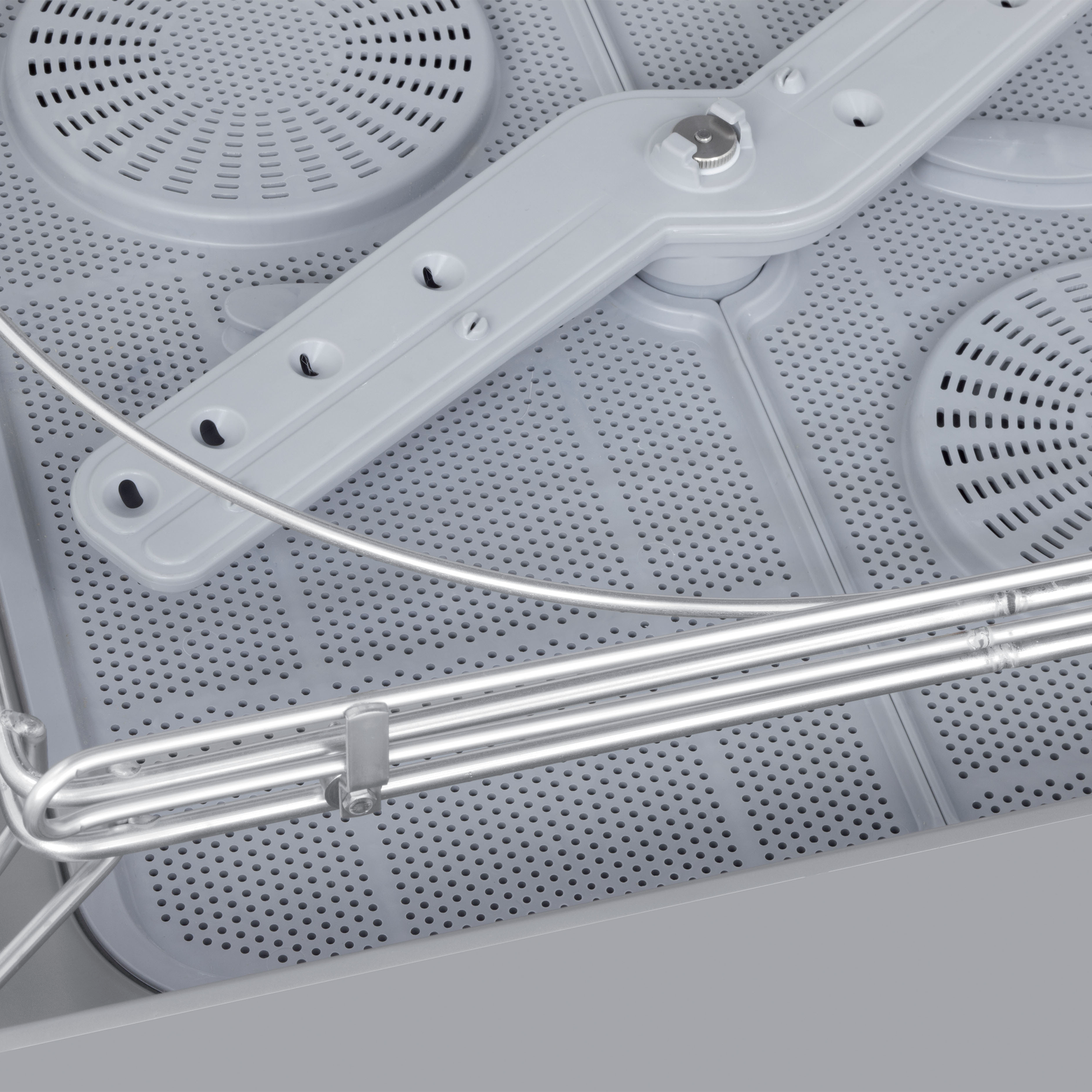 Lavaplatos con puerta de doble pared y brazos de lavado superiores e inferiores.